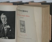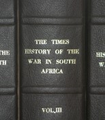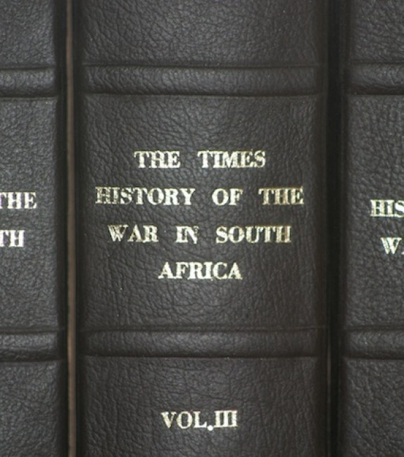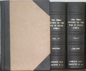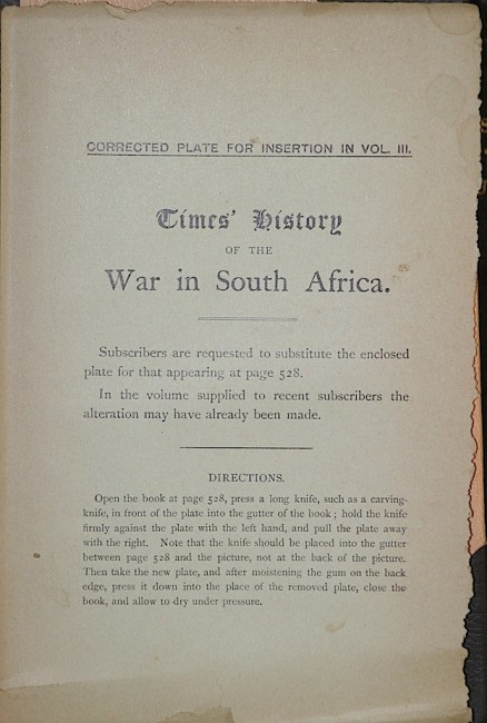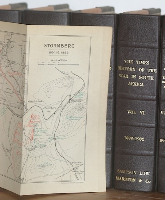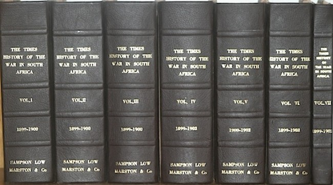 The Times History of The War in South Africa 1899-1902 (7 Volumes) with rare suppressed plate and replacement. Amery, L.S. (ed). London, Sampson Low, Marston and Company, Ltd., 1900-09. Rebound in green and cream full leather, gilt lettering on spine new end papers. The name of the publisher appears at the bottom of the spine of all volumes except the index. Complete in seven volumes. All large fold-out maps present (one loosely inserted). Volume three has the rare suppressed plate of Major-General A. Fitzroy Hart (loosely inserted) as well as the replacement portrait. The even scarcer leaflet with instructions for the insertion of the corrected plate (see photo) is also included with the set. Very light scattered foxing on first and last pages of the volumes, otherwise a very clean and tight set.