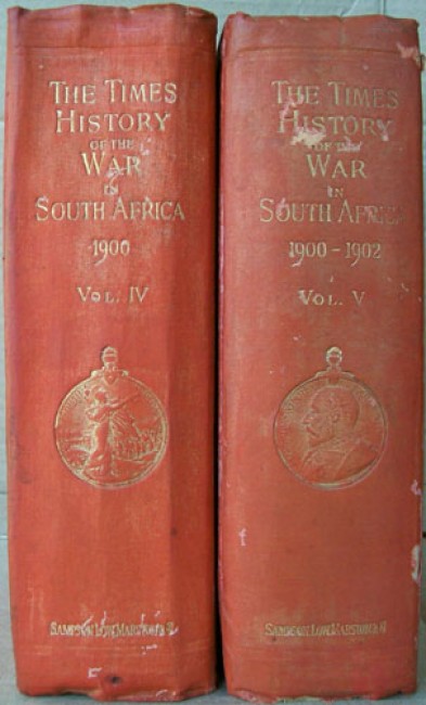2 volumes of the 7 volume set These two odd volumes are: iv and v. Both volumes are bound in the publisher\'s original red cloth boards with gilt titling and medallion decorations on the spines. All edges gilt. Volume 4: xviii prelims, 597 pages,17 photogravure plates, 17 plans and maps, many folding and fold out maps and plans followed by large folding maps of the Transvaal and the Orange Free State in the rear pocket. Volume 5: xxvii prelims, 614 pages, 9 photogravure plates, 25 maps and plans, followed by 3 large folding maps in the pockets. CONDITION DETAILS: Both volumes have fading to the gilt on the spines, and the bindings are a bit worn, bumped and shaken. Internally both volumes are internally reasonably clean, with little soiling, but some of the tissue guards are torn and some of the maps and plans have extra creases. Volume 4 has the engraved book plate of the Library of the Royal Artillery Institution on the front paste down and three purple library stamps on the first few pages, that do not affect the text. There is a blue piece of tape repairing the back hinge which is cracked.