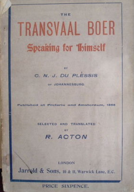 Full title: "The Transvaal Boer speaking for himself: some passages from "Uit de geschiedenis van de Zuid-Afrikaansche Republiek en van de Afrikaanders" by C.N.J. du Plessis (of Johannesburg), published at Pretoria and Amsterdam, 1898; selected and translated by R. Acton." A pro-Boer publication issued in English for the first time. SABIB, 2/118. Wrappers. Pp. 120. Wrappers slightly frayed at edges & darkened