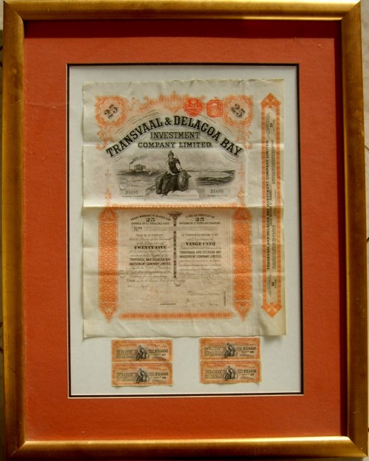 Stock certificate, with coupons, the Transvaal & Delagoa Investment Company, gilt wooden frame, under non-reflective glass, matching mount board, 540 x 690mm, condition; very good.
