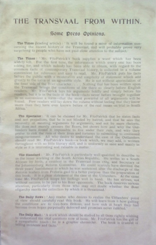 For a balanced view of the events leading up to the Anglo-Boer War of 1899-1902, Fitzpatrick's book is required reading. For this purpose, this copy will suffice - and it still looks well on the bookshelf.