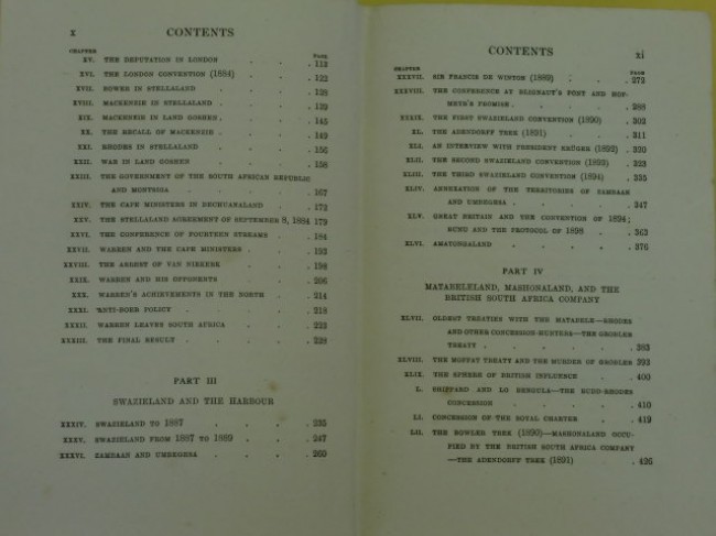 A good, solid copy of the 1919 first edition. Preface:\"In \'The First Annexation of the Transvaal\' the relations of the Boers and the British Government were reviewed from the first settlements in South Africa to the London Convention of 1884. The origin of the Boer people was traced; their early sufferings under British rule; their trek to an unknown Land of Promise; and their struggle for independence, culminating in the Conventions of 1852 and 1854. We saw too how the Orange Free State was deprived of the Diamond Fields, and we followed the development of the Transvaal State, its overthrows in 1877 and the means by which the Boers, biding their time and rejecting such opportunities as the Zulu War, at last regained, in part at least, the independence which had been filched from them... the Republic was gradually enircled by a barrier of British territory which effectively deprived it of all opportunity of outward expansion;... its internal development was impeded by a consistent policy of admonitions, humiliations, instructions, and warnings, followed by threats and demands,...\" In 4 Parts; Zululand and the New Republic, Bechuanaland and the Road to the North, Swazieland and the Harbour, and Matabeleland, Mashonaland, and the British South Africa Company; including choronological table from 1833 The First Trek, to 1899 The War, Book condition: boards and spine very good, gilt spine title, end-papers good (owner inscription), binding very good, page edges and end-papers foxed and spotted, some foxing to text, otherwise a very handsome copy. This book constitutes a remarkable chronological record of the history of the Boer nation and its struggle in the face of British Imperialism, and includes many documents, either quoted in full or in part, such as: Treaty between the Boers and the Zulus, Dinizulu\'s Proclamation, Proclamations of the Govt. of the new Republic, Proclamation of May 11, 1887, declaring Zululand a British Possession, Treaties, Notices, Instructions, Contracts, Conventions, Concessions, etc... plus Appendices A to T documenting letters, extracts from private correspondence, contracts, articles, treaties, charters, etc..etc...total 603pp. plus fold-out maps at end.