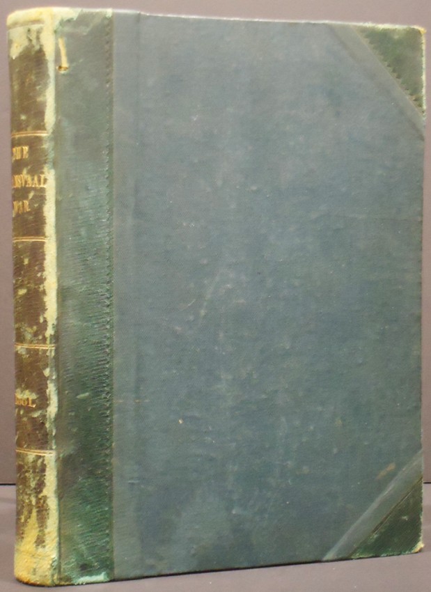 450 pages, folding map as frontispiece, portrait, 2 folding plans, light foxing, half blue leather with matching grained cloth, titled gilt on the spine, starting to wear at the hinges, worn at the edges of the spine and the covers, chips on the back cover, a good copy.