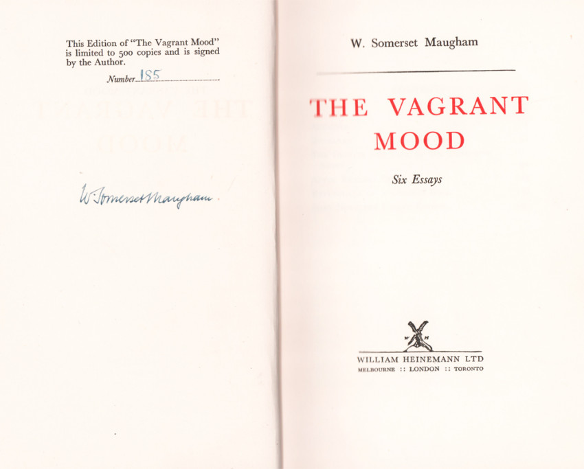 Limitation reads: This edition of The Vagrant Mood is limited to 500 copies and is signed by the author. Number 185