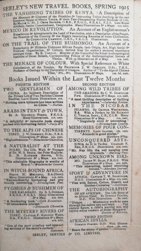 Grey-green cloth-boards with gilt lettering to the spine, plain endpapers, 284 pp of prelims, text and index, with frontispiece, 27 other illustrations in the text and two maps, including a large folding one at the back, plus publisher's announcements (all illustrated)