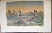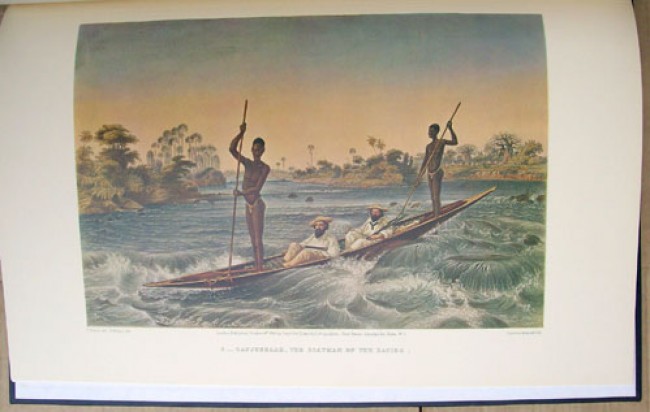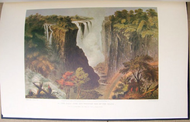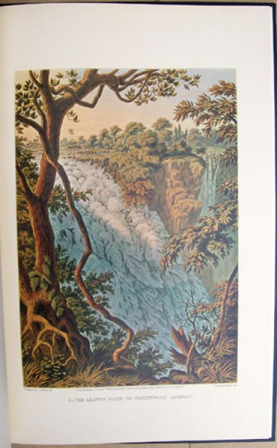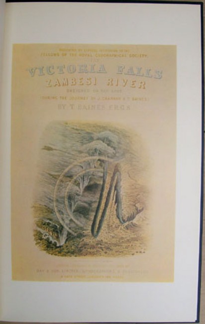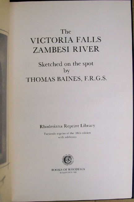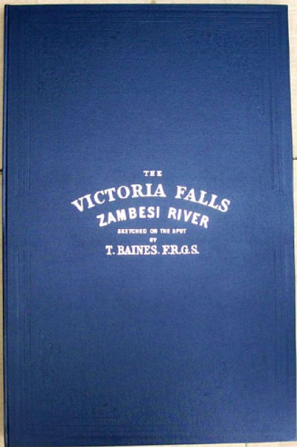 Original blue simulated leather binding with gilt titling on the upper board with blind stamped decorations. Full page sepia photographic frontis portrait of Thomas Baines, 2 pages of the new publisher's introduction, giving a total of 8 pages of text followed by the 10 colour plates. Including the facsimile of the original title page, there are a total of 11 colour plates.