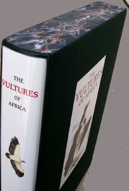 This copy is housed in a custom built slip case by master craftsman, Peter Carstens, covered with black coth and hand marbled paper and leather trim. The image in-set on the upper side of the slip case is identical to the front side of the pre-publication brochure.