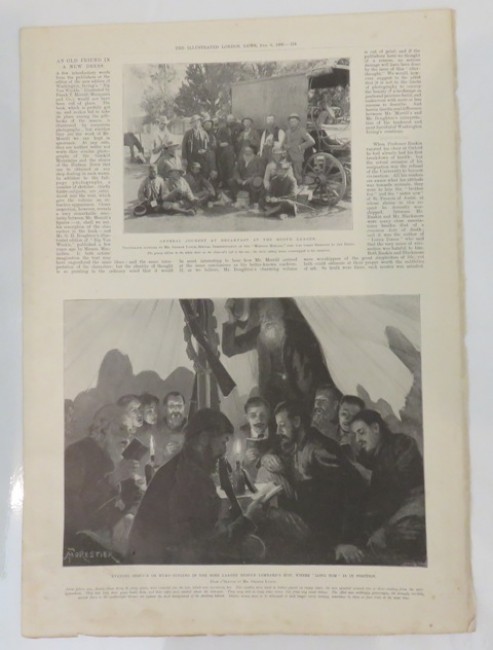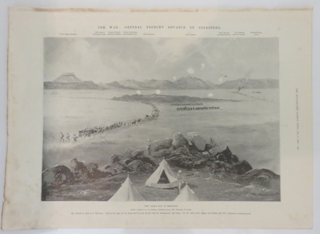 Two pages. Images on reverse: "General Joubert at breakfast at the Hoofd Laager" and "Evening service or hymn-singing in the Boer Laager..."