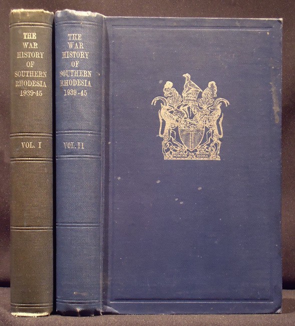 2 volumes, 673 pages continuously paginated + (xiv) roll of honour + xxx pages index, frontispiece in volume 2, 6 folding maps - 4 coloured, 19 colour plates, many black & white plates and maps in the text, linocut chapter headpieces, original dark blue cloth titled in silver and with the Rhodesian coat of arms on the upper cover – the spines are slightly faded.