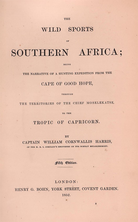 Fifth (and best) Edition: 359 pages, hand coloured lithographic frontispiece, hand coloured vignette on title page, 24 hand coloured lithographic plates, folding map, bound in pebble-grained red cloth with gilt vignette of a rhino on the upper cover with blind decoration on both covers, decorative gilt on the spine, all edges gilt, a very good copy.