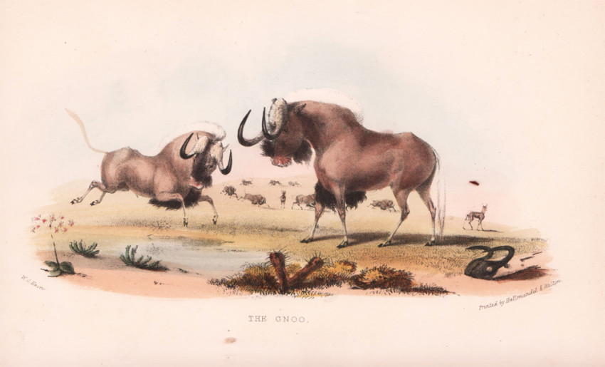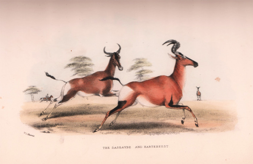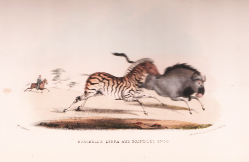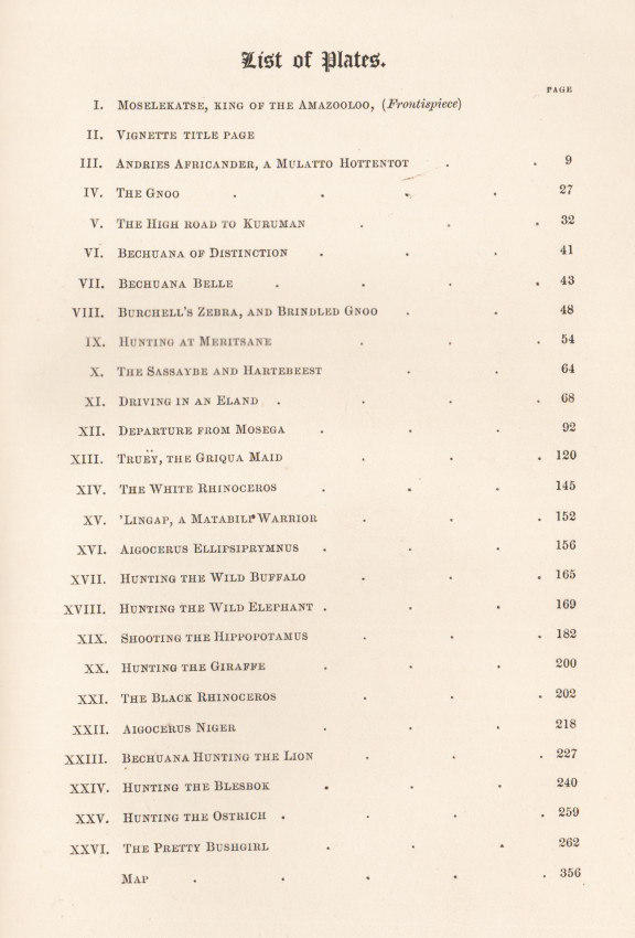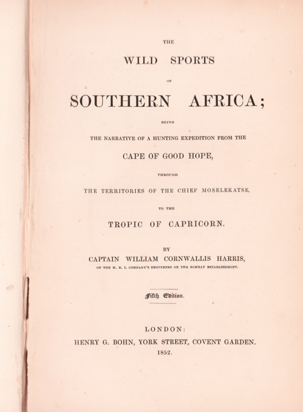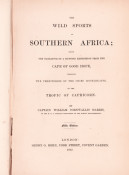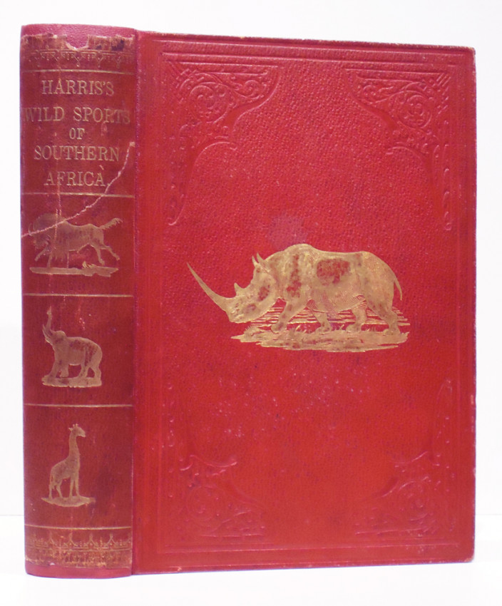 Fifth (and best) Edition: 359 pages, hand coloured lithographic frontispiece, hand coloured vignette on title page, 24 hand coloured lithographic plates, folding map, bound in pebble-grained red cloth with gilt vignette of a rhino on the upper cover with blind decoration on both covers, decorative gilt on the spine, all edges gilt, a very good copy.
