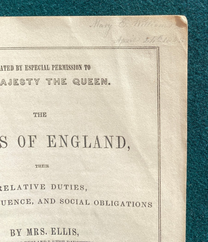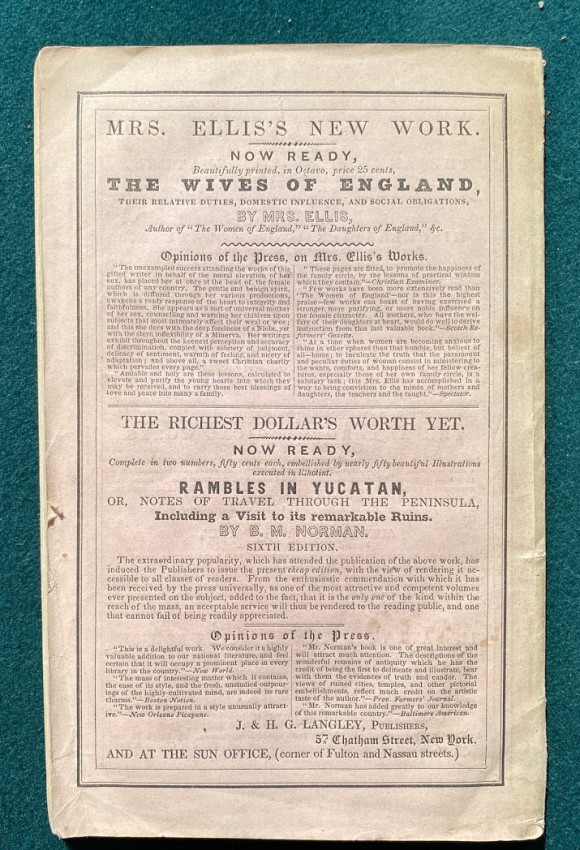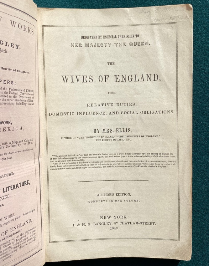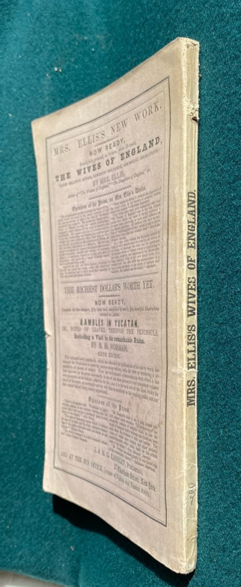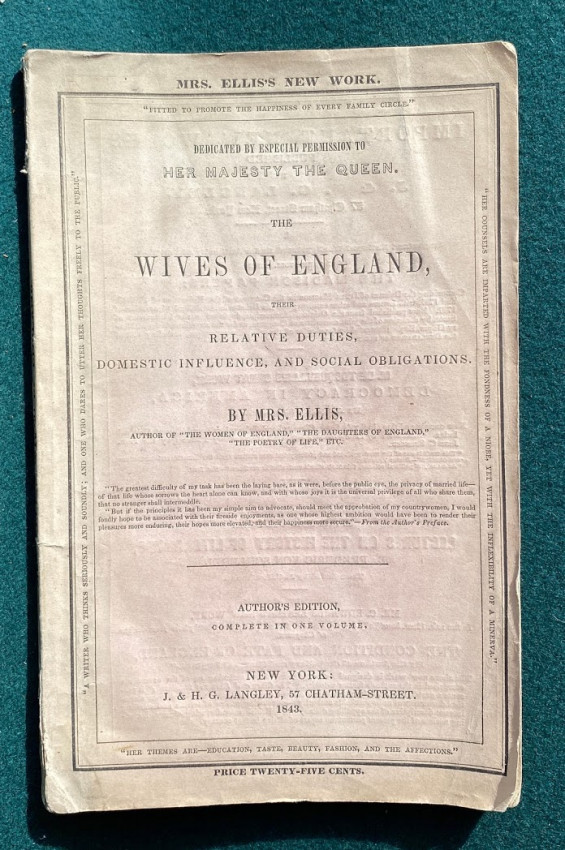 The Wives of England, their relative duties, domestic influence, and social obligations ... Athor's edition, completein oe volume. New York: J. & H.G. Langley, 1843. Octavo (9 1/8 x 5 3/4in;232 x 146mm), pp. [1-]116. (Light soiling to first and last few pages.) Publisher’s paper wrappers (some light discoloration and a few smal tears). Provenance: Mary E Williams (inscription dated 24 April 1843).