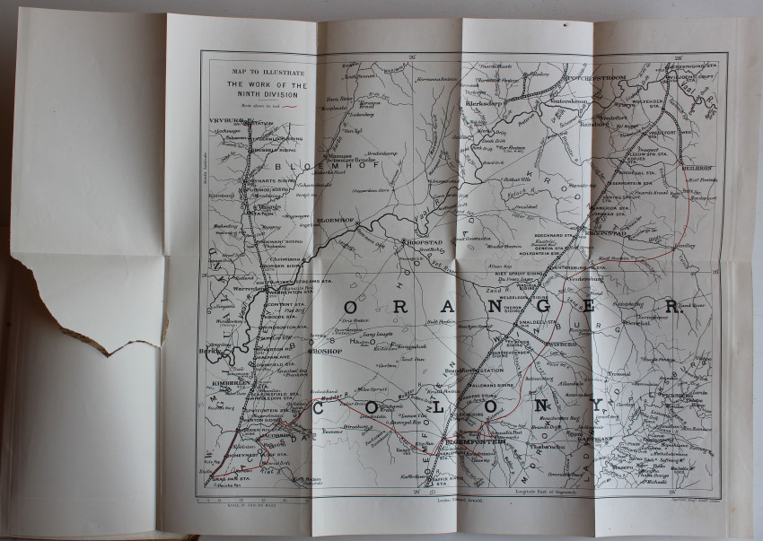 General Colvile landed at Cape Town on November 15, 1899, and left the same night for Lord Methuen's headquarters, being present at the Battle of Belmont, but not at Magersfontein. He was appointed to the command of the newly organized Ninth Division and remained in charge of it until it was disbanded. The force took part in the batlles of Paardeberg, Poplar Grove and Sanna's Post; and in the forward march of Lord Roberts through the Free State and the Transvaal. (Mendelssohn)