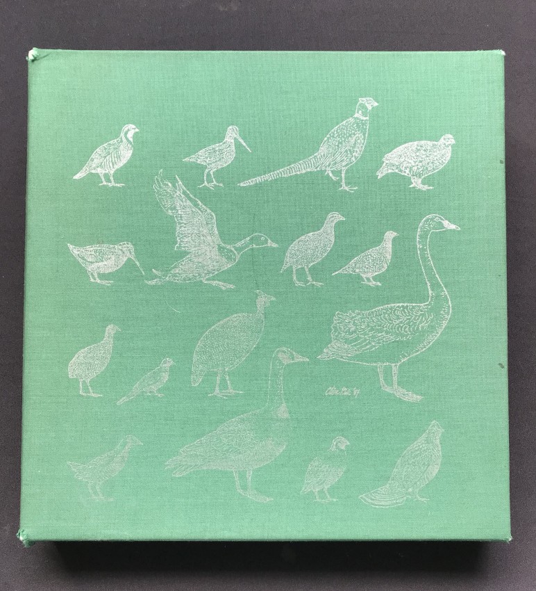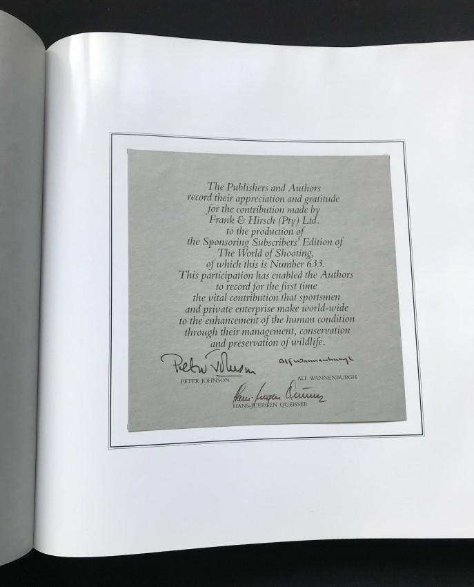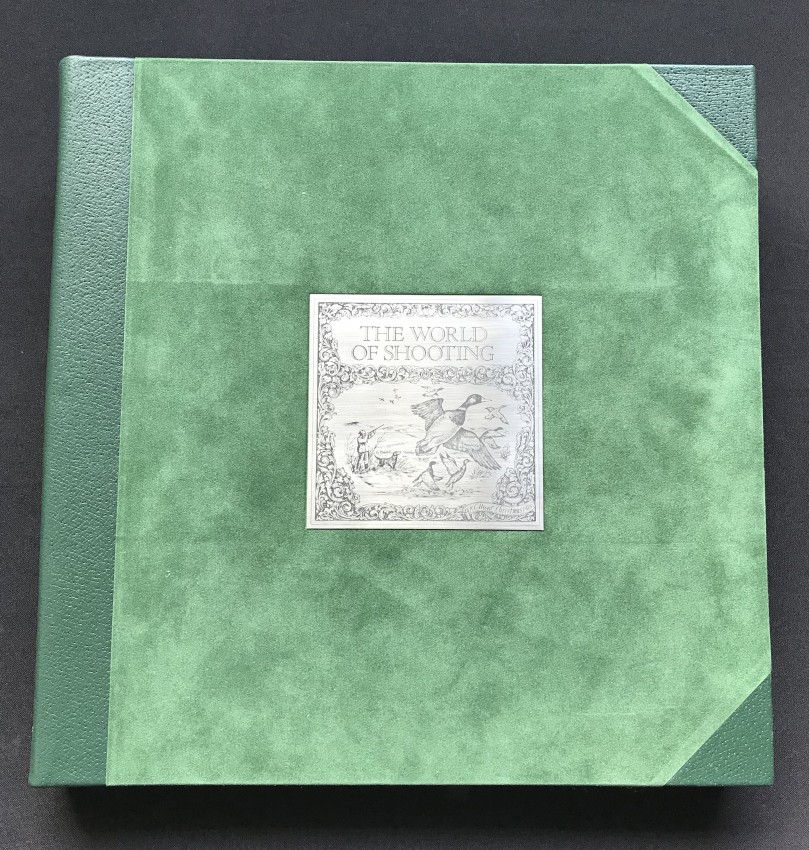 Profusely illustrated with magnificent photographs by Johnson. There is a stainless steel etching (4" x 4") set into the upper cover; this is a reproduction of a sporting scene by the English Master Engraver - Ken Hunt. It is an international game shooting work, and was marketed to the great and the good of the world's shooting fraternity, with many copies going to the USA, Australia, Spain, Portugal, etc.