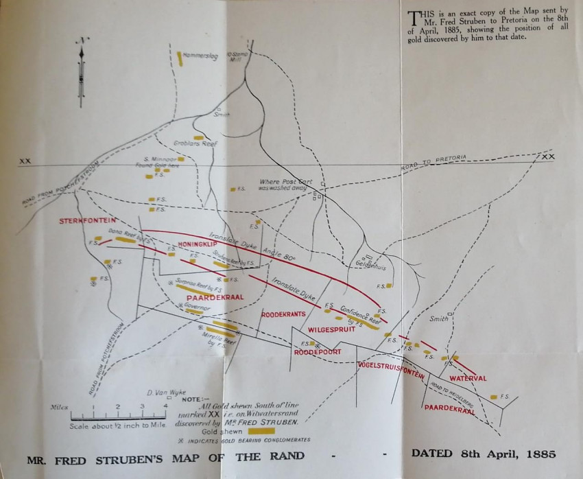 - The Map of the Rand "is an exact copy of the map sent by Mr Fred Struben to Pretoria on the 8th of April, 1885, showing the position of all gold discovered by him to that date"; it is printed in three colours at a scale of "about half an inch to the mile"; this 8-fold map is undamaged and in very good condition