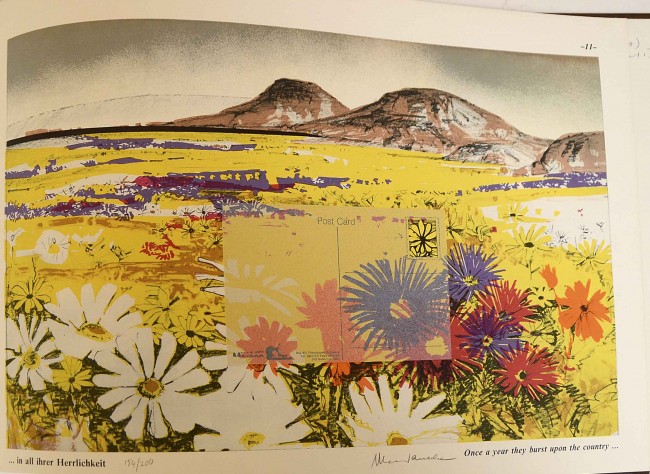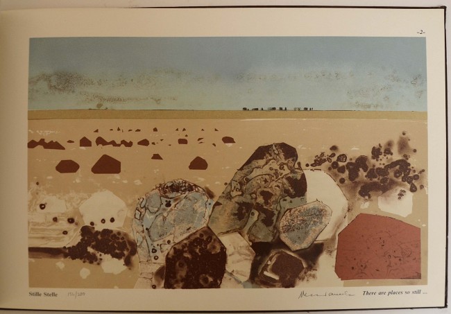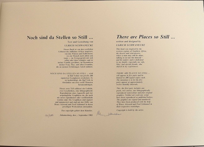 Large oblong folio book bound in skivertex. A note from the author/artist states that this is the first part of five volumes limited to 200 copies each, to be published at twelve monthly intervals. I have not personally encountered the other four volumes and am unsure whether they were ever published. The artist certainly did subsequently publish several other much smaller scale "Artists Books". This book is number 154 of 200 copies signed by the artist and printed on fine quality art paper. The work comprises 4 original signed and numbered lithographs, one lithographically reproduced watercolour and text comprising one poem and two stories (in Engish and German). The graphics were printed with the help of and in the respective studios of Bruce Attwood and Fred Schimmel.