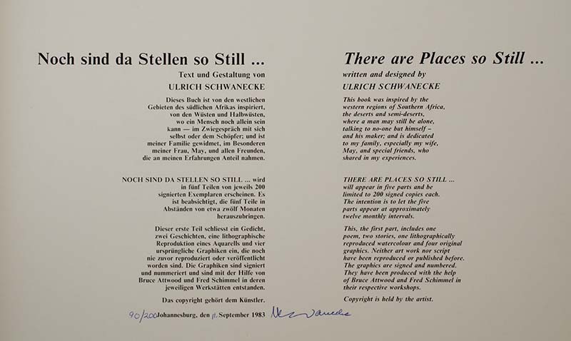 The work comprises 4 original signed and numbered lithographs, one lithographically reproduced watercolour and text comprising one poem and two stories (in English and German). The graphics were printed with the help of and in the respective studios of Bruce Attwood and Fred Schimmel.