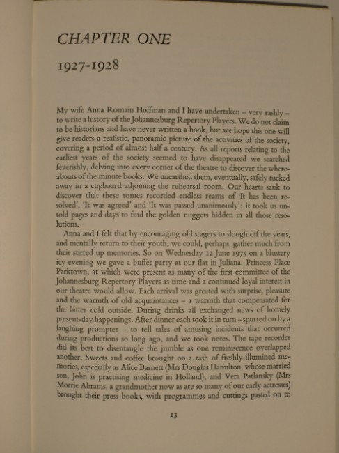This book covers forty-two years of theatrical production, amateur and then professional, and is the story of a promise kept to the people of Johannesburg. The book records almost every play from R.U.R. produced in 1928 to Present Laughter in 1969; 211pp., signed with inscription on f.f.e.p.