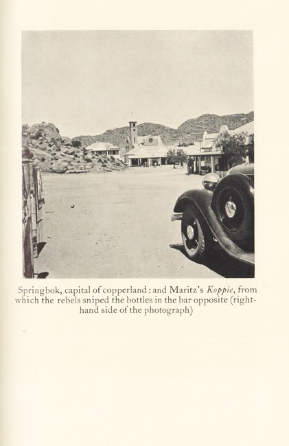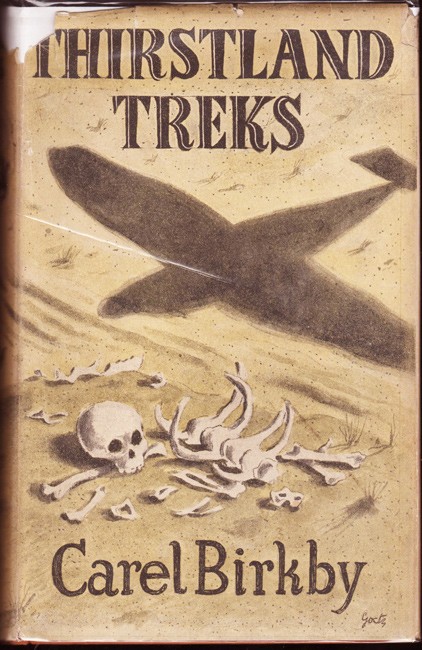 ‘The desert regions of Southern Africa – Bushmanland, Namaqualand, Namib and Kalahari – are summed by Mr. Birkby under the name Thirstland. Mr. Birkby is the son of an old-time prospector; he grew up on the edge of Thirstland, fascinated by the stories of it. He is now on the staff of a South African newspaper group, and has sought every opportunity to know this desert district as intimately as any man alive. He writes of the people of the desert region, their adventures, their mysteries, of diamond fields and crooks, coastal islands, camel police, pioneers, native peoples, river folk, game reserves, treasure and prospecting.’ Editor’s note.
