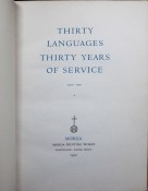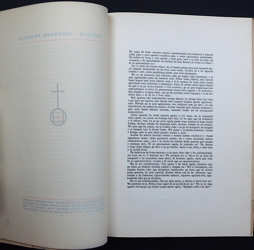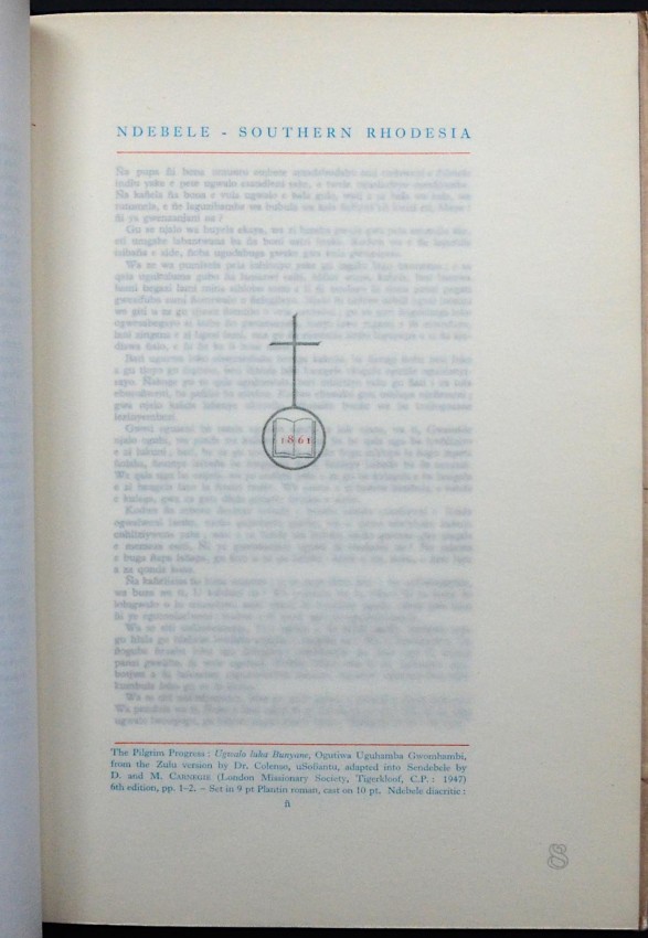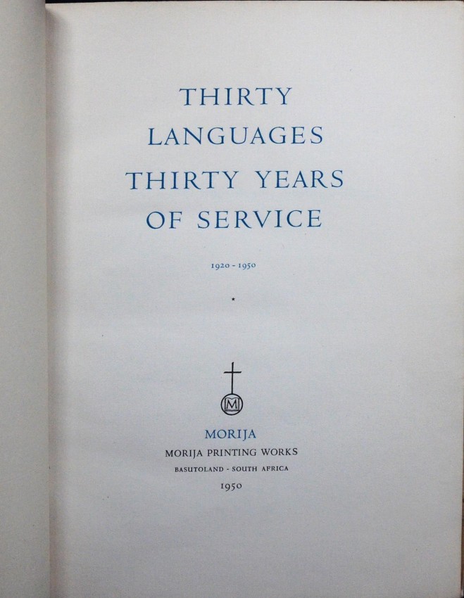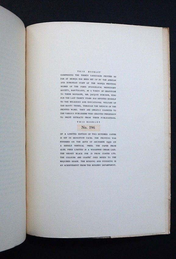 This booklet comprising the thirty languages printed so far at Morija has been set up by the African and European staff of the Morija Printing Works of the Paris Evangelical Missionary Society, Basutoland, as a token of gratitude to their manager, Mr. Jaques Zurcher. who for the last thirty years has devoted himself to the religious and educational welfare of the Bantu Tribes, through the medium of the printed word. They are greatly indebted to the various publishers who granted permission to print extracts from their publications. This booklet, No. 196 of a Limited Edition of two hundred copies is set in monotype faces. The printing was finished on the 20th. December 1950 on a Miehle vertical press. The paper from Alex. Pirie Limited is a woodfree cream laid. The Neoset black ink is from Coates Ltd. The colours are Coates' inks mixed to the required shade. The binding and finishing is an achievement from the Bindery department.