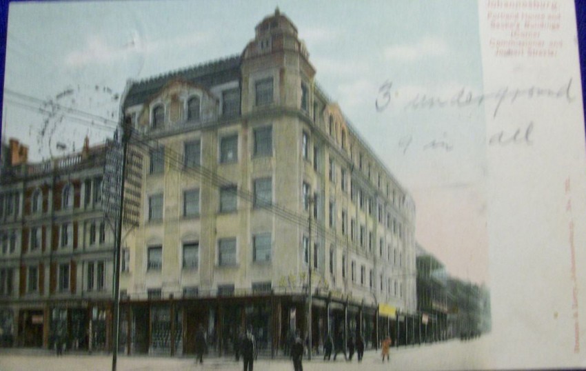Johannesburg- Portland House and Sacke's Buildings. (Corner Commissioner & Joubert Streets) No. 793. Coloured. Used and postmark and stamp 21st October 1906.