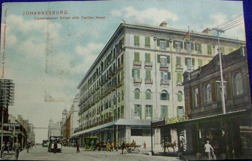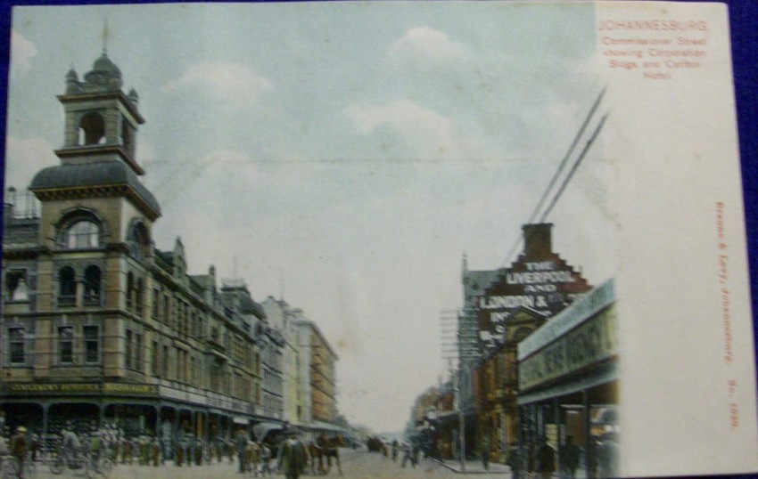 Johannesburg-Commissioner Street showing Corporation Buildings and Carlton Hotel. No. 1030. Coloured.