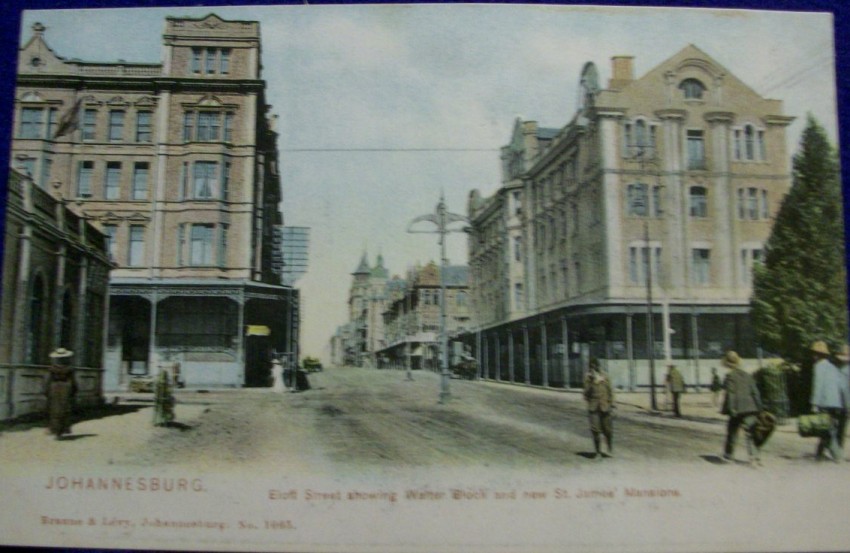 Johannesburg- Eloff Street showing Walter Block & new St. James Mansions. No. 1065. Coloured.