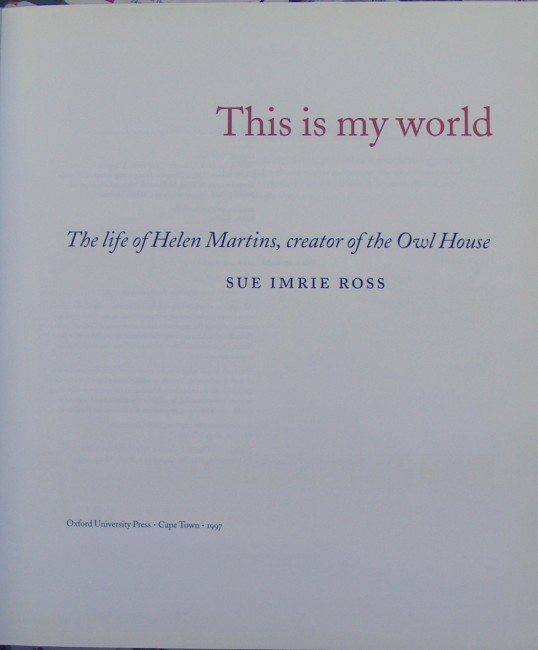 This is my World, The Life of Helen Martins, creator of the Owl House, Oxford, forward, introduction, chronology, plans, map, bibliography, interviews, profusely illustrated, 272 pages, condition: very good.