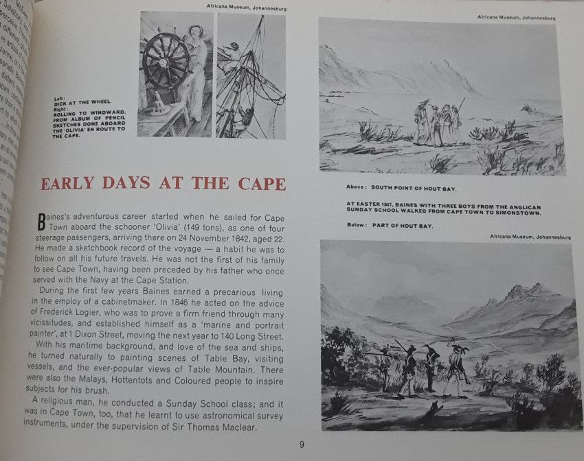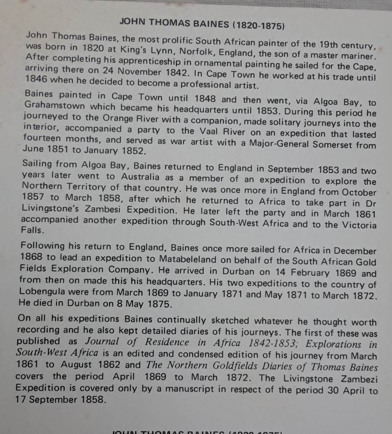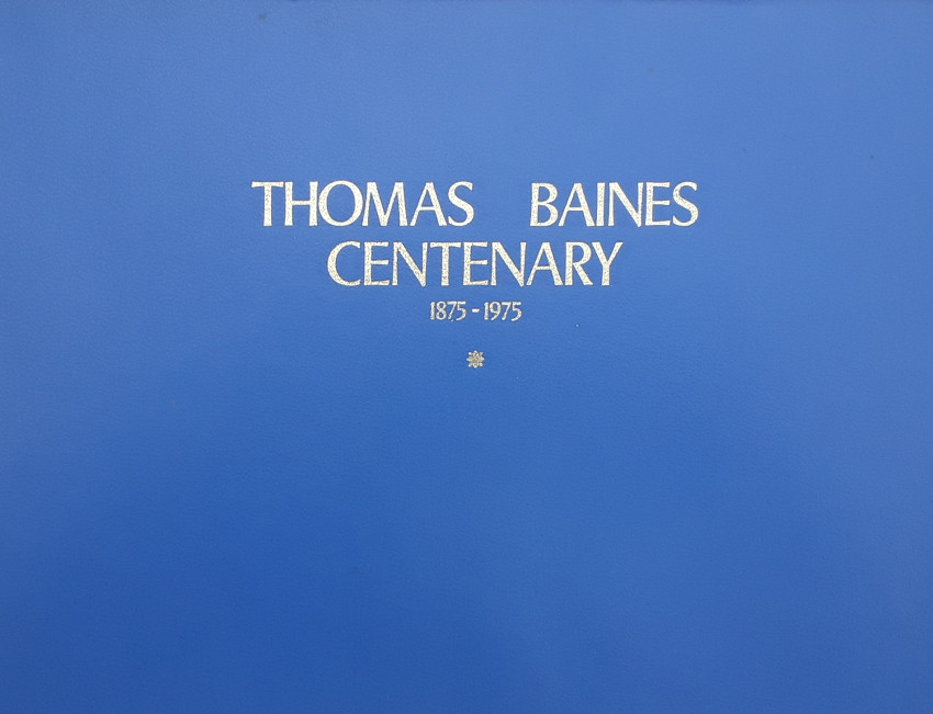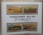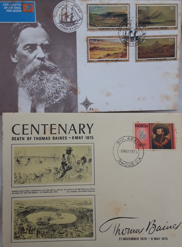 Comes with two commemorative first day covers, issued in South Africa (sheet with 4 stamps, information card featuring one of Baines' paintings on verso) and Bulawayo, Rhodesia.