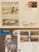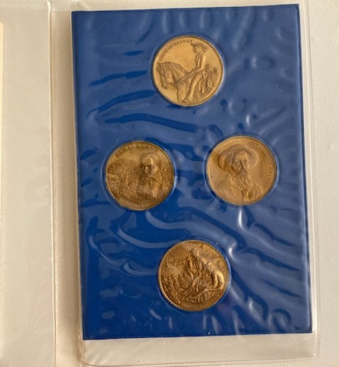 32 pages: illustrations (some colour), portraits. Paperback booklet placed in a folder together with two postal covers and four numbered bronze medallions. The folder is housed in a paper covered presentation box.