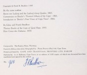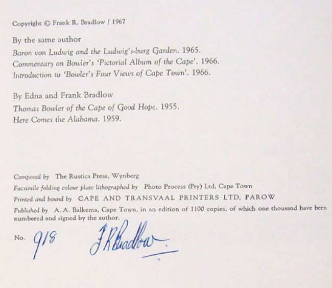 Copy number 918 signed by Frank Bradlow and limited to 1100 copies. Original errata slip loosely inserted. Original dust jacket. Original greyish coloured buckram boards with gilt titling on the spine and the publisher's decorative device on the upper board.318 pages, 30 colour plates, some tipped in and including the large folded facsimile reproduction at the rear, monochrome plates and line drawings.