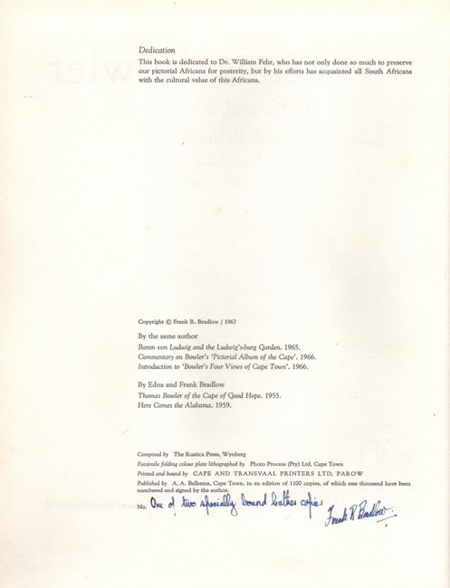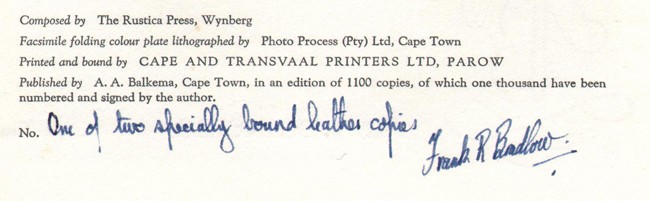 Inscribed by Frank Bradlow as follows on the limitation page: ‘One of two specially bound leather copies, Frank R. Bradlow.’ (The standard edition limited to 1100 copies of which 1000 are signed by the author.)