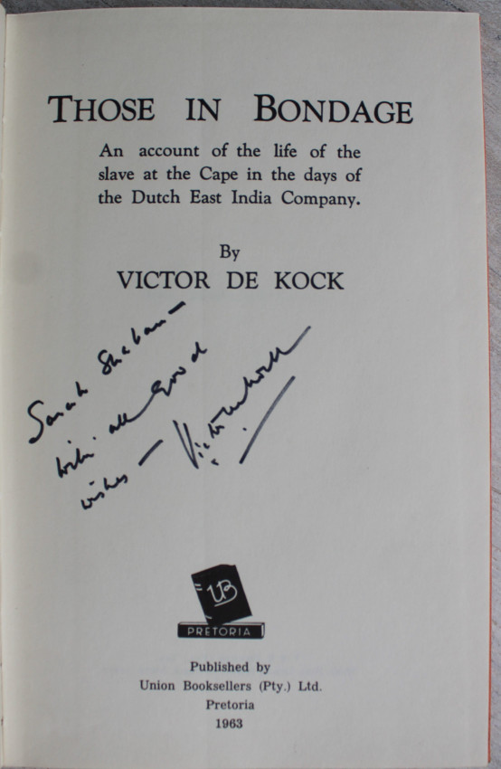 Signed and inscribed by De Kock on the title page. Orange-brown coloth covers, black titles in gilt to front and spine, 240 pages. Mapped endpapers. Dust jacket has slight edge wear.