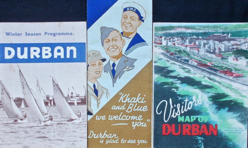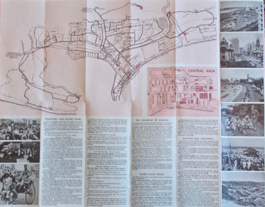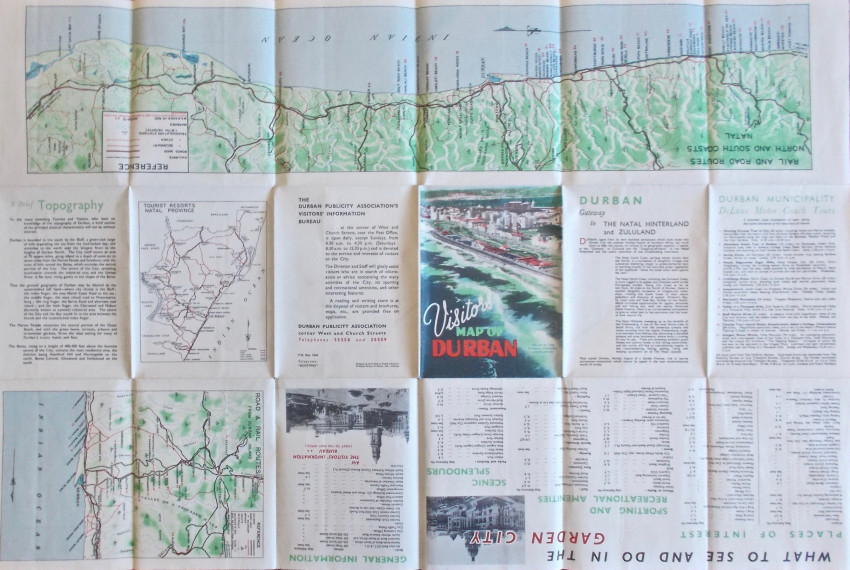 2) Welcome to Durban “Khaki and Blue We Welcome You” (Early 1940s). Very good illustrated paper covers. This 23cm x 9cm guide opens up to 55cm x 43cm and features a large plan of central Durban with details on Canteens and Clubs; Entertainments; Banks; The Post Office; Churches; Taxi and Rickshaw Charges; Sport; Places of Interest; Consular Representatives; Transport and Motor Tours; Bathing and Swimming etc. This guide was produced for South African and Allied troops in Durban during World War Two. Visitors Map to Durban (Late 1940s/Early 1950s). Home Journal Press, Durban. E. P. & C. P. Co., Ltd., Durban