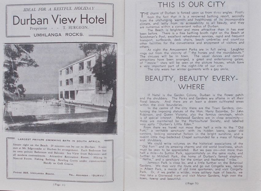 Durban Winter Season Programme (1937) Very good illustrated thin card covers with titles in white and blue on the front cover. 46pp with 10 black and white illustrations. An introduction to Durban with details of events in the city from 29th. May to 29th August. Also included is information about: The Aquarium; Golf Courses; Race Courses; Bay Cruises; Bowling Greens and the Zulu Reserve.