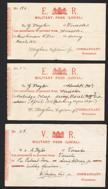 Cape Colony, Martial Law, passes issued by officers in Worcester for a Mr G.Keyler to travel to various places – Parbridge Kloof, Bushmans Vlei & The Retreat Farm – during February, March & April, 1901.