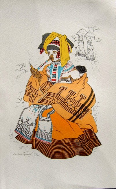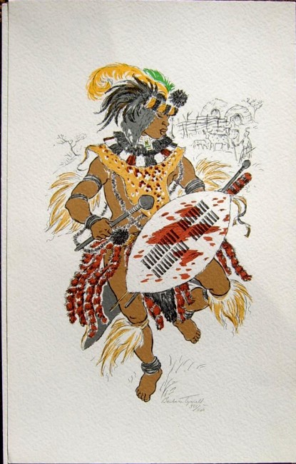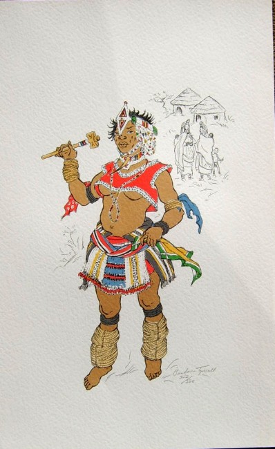Barbara Tyrrell is an internationally recognized artist known for her detailed costume studies of the traditional dress of the tribal peoples of southern Africa.The artist was born on March 15th 1912 in KZN and died at Fishhoek in the Cape at the age of 103, on September 23rd, 2015. Her paintings in water colour, gouache and oils constitute one of the most important historical records of a world that was vanishing even as she worked. She always drew from life, which gave her work an integrity not found in the work of artists using secondary sources, such as photographs, as reference. Her father, who died while she was a small child, had occupied the post of assistant magistrate and later interpreter in the Department of Native Affairs in Zululand. Her grandfather was Frederick Fynney, interpreter and companion to the Zulu King Cetshwayo (1826 – 1884).
