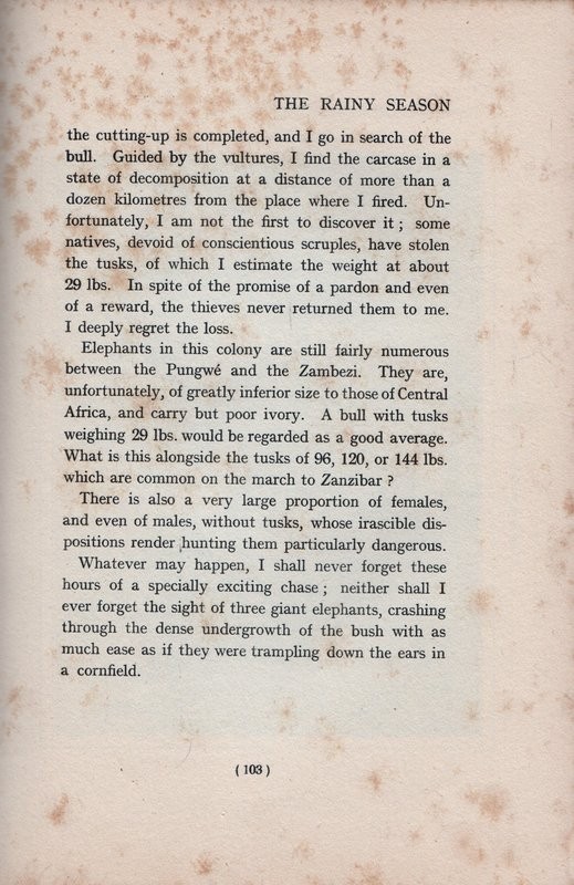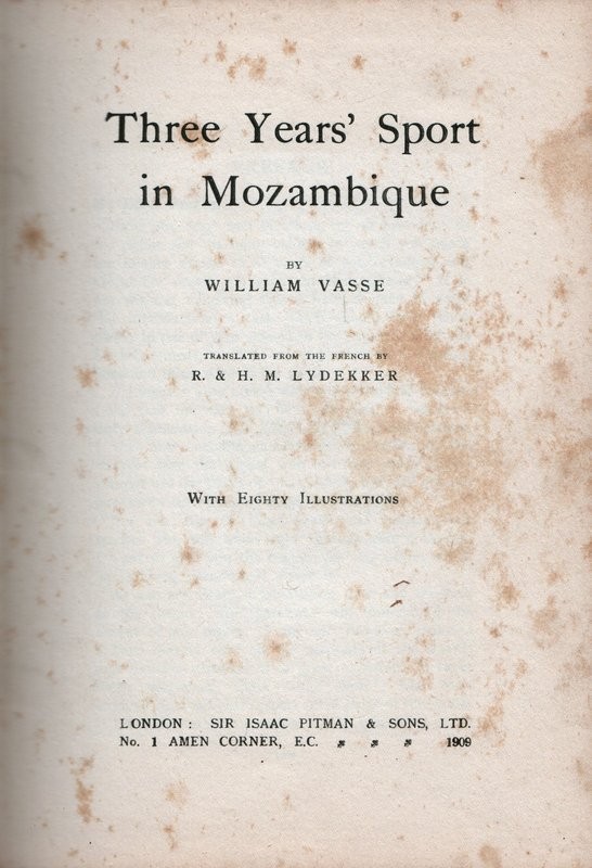 From Czech: "Guillaume Vasse (even his name was translated) sailed to Mozambique in 1904 to enjoy an extended hunting trip. Proceeding into the foothills of the Drakensberg Range, he collected klipspringer and bushbuck, then travelled to the Zombi River where he bagged sable. Near the Pungwi River, Vasse hunted eland, hartebeest, waterbuck, and buffalo. Numerous leopard were bagged in the region, as well as elephant. Continuing on to the Sungwi River, he also collected a number of lion. Entering the Zambezi, hippopotamus was added to the bag, as was kudu. This is an excellent work of sporting adventure, well illustrated with numerous photographs, and quite scarce".