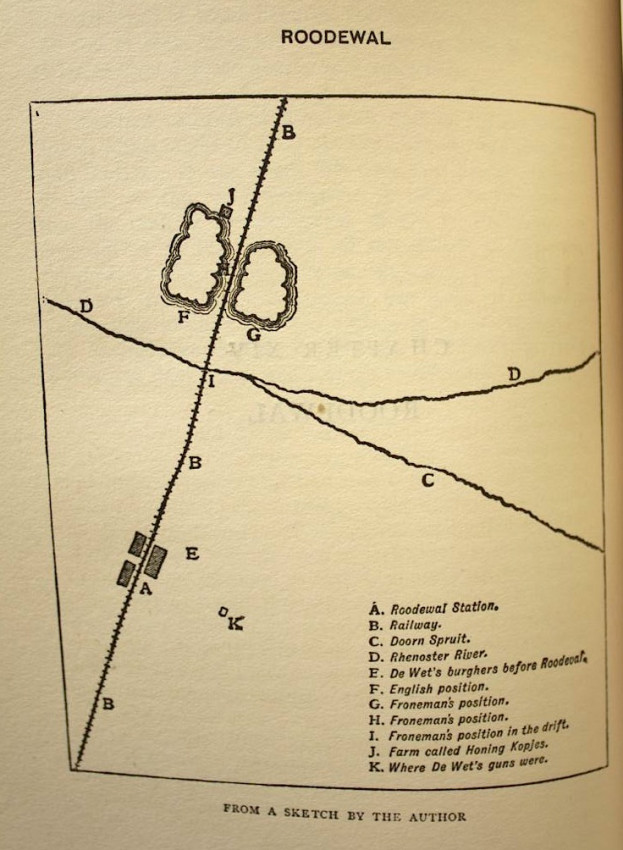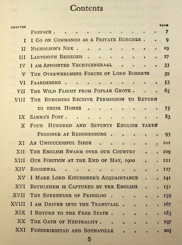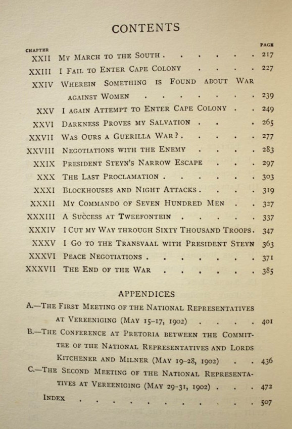 'Right to the last, speaking at Vereeniging, De Wet remarked, in a speech of considerable vigour, "We must fight on, no matter how long, until our independence is absolutely secure," and there appears no reason to doubt that he was fully prepared to continue the conflict, although he subsequently acquiesced with the views of the majority of the delegates. Severe reprobation is accorded to the "National Scouts," to whose action is attributed the final downfall of the Boer cause, and heavy censure is bestowed on General Prinsloo, Vilonel, and others, who surrendered to the British forces. De Wet expresses contempt for the blockhouse system, but he asserts that the "drives" were a very different matter; he gives a flat denial to the widespread statement that he escaped through the blockhouse cordon by driving a herd of cattle through the barbed wire fencing, but he admits that the night marches tended greatly to the demoralisation of the Burgher forces. Attention is repeatedly drawn to the overwhelming strength of the British, but, from the information afforded, it does not appear clear that there was any great disparity in numbers, on either side, in the majority of actual engagements. There can be little doubt that in some of the actions the Boers were struck by panic, and had to be forced - not always successfully - to continue fighting, and there is ample evidence that the courage and resourcefulness of De Wet were counteracted by the difficulties which he had to contend with owing to the insubordination of his men.' - Mendelssohn Vol.I, page 460.