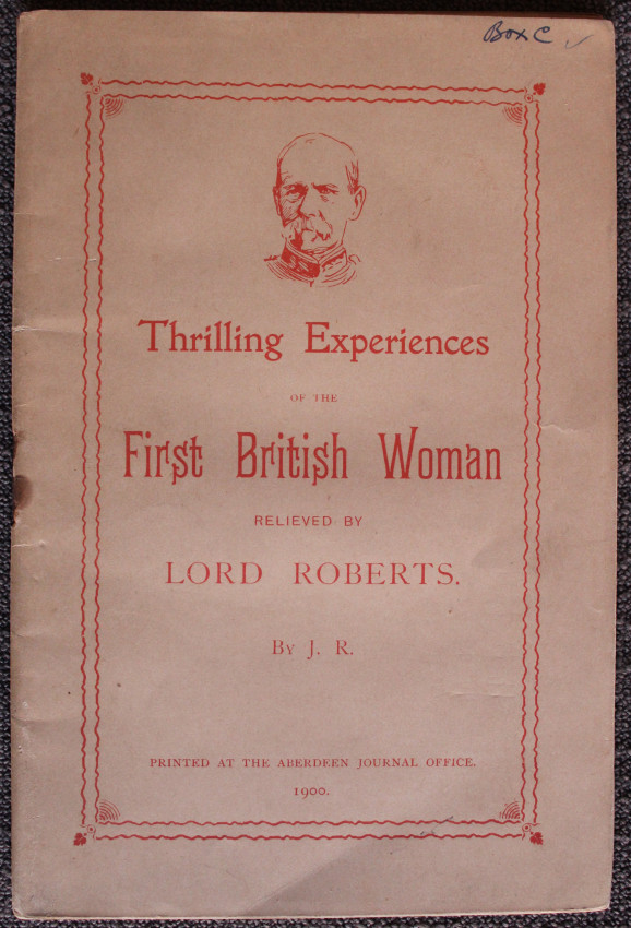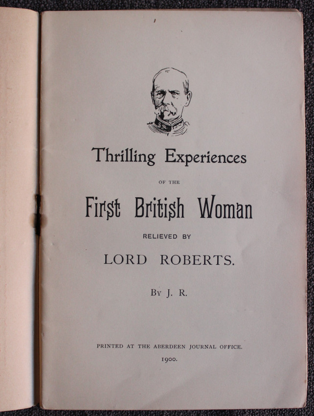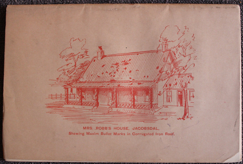 Printed at the Aberdeen Journal Office in 1900. Stapled booklet of 40 pages in very good condition. 40 Pages, 8vo (180 x 120 mm), illustration of Mrs Robb's house, Jacobsdal, Shewing Maxim Bullet Marks in Corrugated Iron Roof on the back cover, printed brown light card covers. (A South African Bibliography, volume 4, page 49) Name in ink on front wrapper top edge.