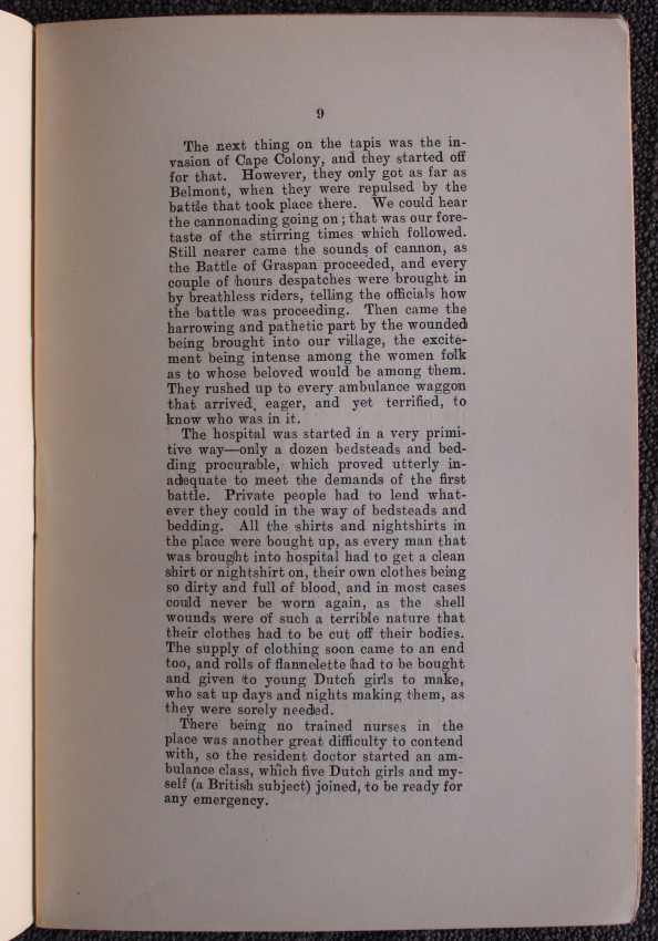 'A diary of four and half months spent in Jacobsdal, O.F.S. during the South African War. Jacobsdal is a small village in the Orange Free State about thirty miles south-east in Kimberley. Her husband, away on business and unable to return to the Free State for fear of being commandeered for goods or personal service, Mrs Robb decided to stay in what she describes as 'this intensely Dutch village.' Although not trained, she volunteered at the local hospital as a nurse and attended the wounded - Boer, British and African. She comments interestingly on life in the town during the occupation by the Boer forces and upon her work in the hospital which, for some of the time, was taken over by a German ambulance which she describes as being 'fully equipped with all the latest improvements.' The hospital received wounded from the major battles which took place in the area including Magersfontein.