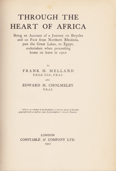Czech: An annotated Bibliography of African Big Game hunting Books, 1785 to 1950, page 113, ‘Using bicycles as a break from the monotony of “foot slogging,” Melland and Cholmeley set out from Kasama with the intention of traveling to the Nile. Passing through German East Africa near the shores of Lake Tanganyika, the pair bagged leopard and numerous crocodile. In the Bogoma forest near the Albert Nyanza, elephant was hunted, with additional chapters on hunting elephant in the Masindi District in Uganda. An interesting work of travel and sport complete with numerous bicycle breakdowns.