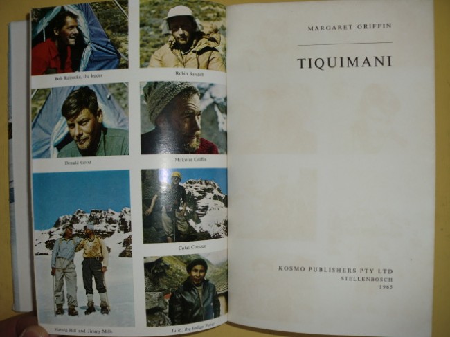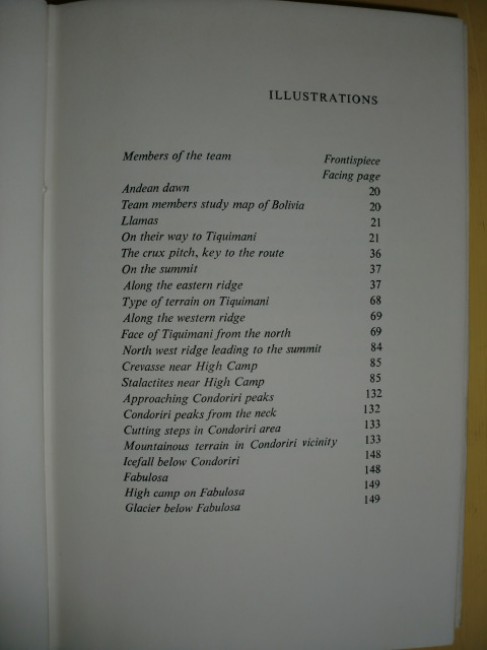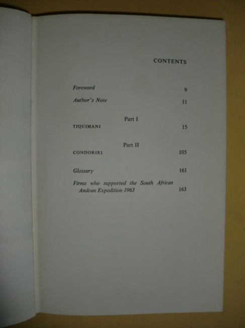 '"Unclimbed, and said to be unclimbable" was how the American mountaineer and Andes expert Evelio Echevarria described the mysterious Tiquimani, a snow-capped rock bastion which soars 18,500ft. into the icy air of the Bolivian Andes. For a team of South African volunteers this was the challenge they were seeking. So they planned the first organised South African mountaineering expedition to go beyond the shores of Africa. They went to Tiquimani, the unclimbable, and conquered it,'[front flap notes].