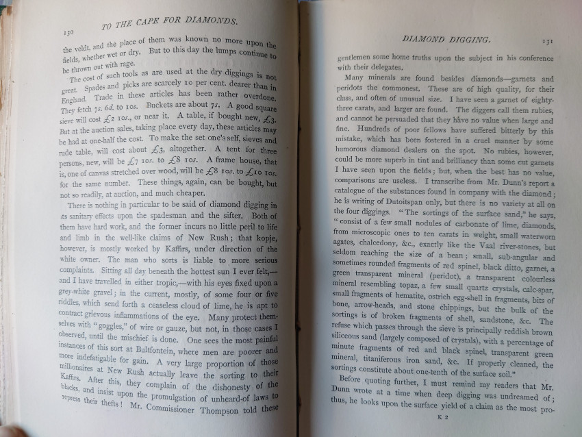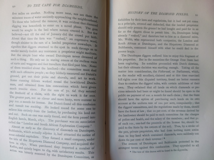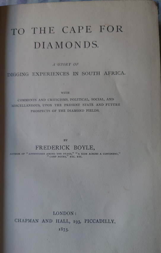Boyle was a British correspondent who spent 5 months in late 1871 to early 1872 in South Africa in the earliest days of the diamond mining period. He discusses the forceable annexation of diamond-bearing lands from the indigenous peoples to the diamond companies and how local government was formed by miners and laws enforced by miners. Boyle describes the alluvial diggings along Vaal River near Pniel and the mining industry at the pipe diggings of Dutoitspan, Bultfontein and Alexandersfontein. His descriptions of the diamonds is one of the earliest published systematic descriptions of diamond crystals. Boyle accurately predicted that chaos would result as the diggings went deeper and a consolidation of the companies into a large company was needed.