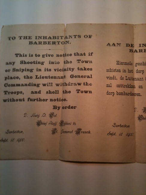 \"Notice given to Pilcher\'s Column for distribution in Barberton after the occupation of the Town CCh\"