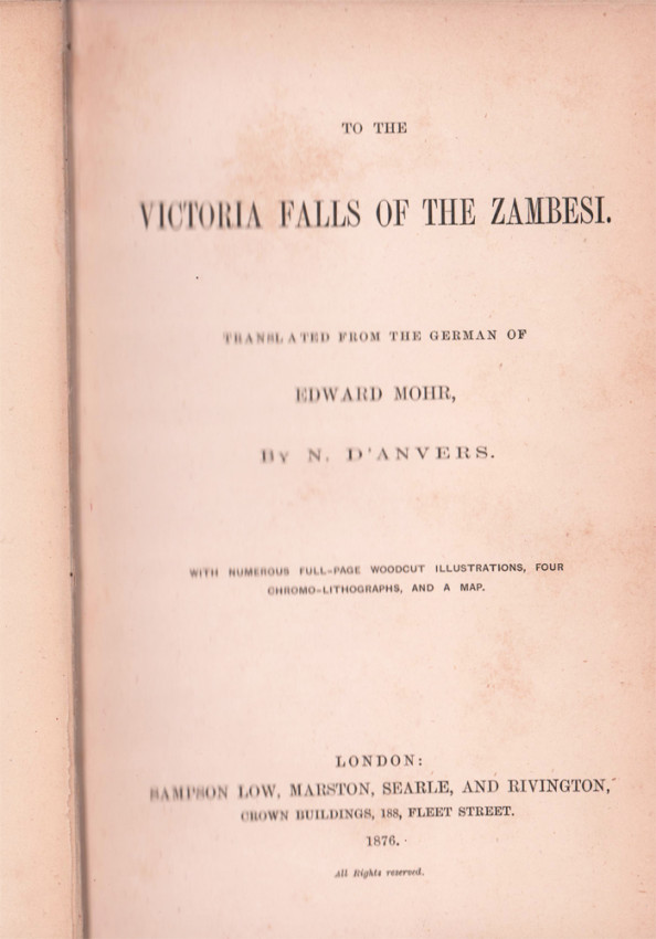 Czech (Dr Kenneth) An Annotated Bibliography of African Big Game Hunting Books 1785-1999, page 198, ‘A German sportsman, Mohr travelled to the Victoria Falls “partly for the sake of hunting, partly in the hope of making geographical discoveries.” After landing at Cape Town, he and his companions ventured into the interior, crossing the Tugela River and enjoying a wide variety of sport. Eland, buffalo, black rhinoceros and kudu were bagged. Near the Matopo Mountains, they hunted eland and wildebeest with Dreyse needle-guns, an early form of breech loader that would achieve great fame in the Franco-Prussian War which was being waged during Mohr’s expedition. Marching from Tati to the Zambesi, lion and elephant were collected, with additional rhino and buffalo taken near the falls. An excellent work of exploration and sport,'