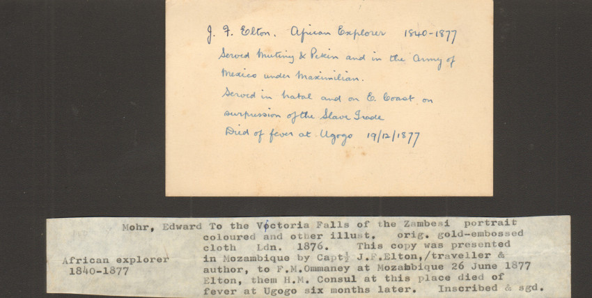 The inscription on the half title page reads; F.M. Commaney from J.F. Elton June 26 1877 Mozambique Loosely inserted is an annotation which states that this copy was presented in Mozambique by Capt J.F. Elton/ traveller and author to F.M. Commaney at Mozambique on 26 June 1877. Elton, then H.M. Consul at this place died of fever at Ugogo 6 months later.