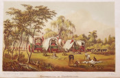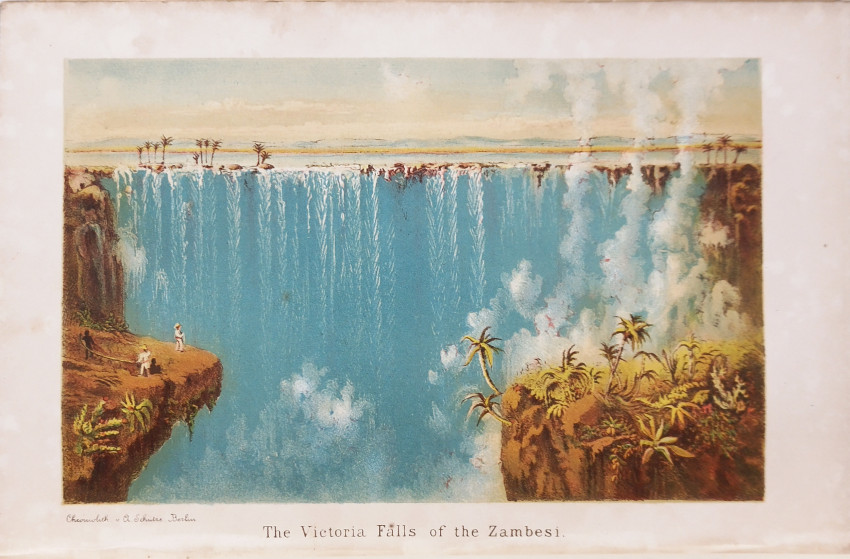 First edition: xiv + 462 pages, frontispiece portrait folding map, 4 chromolithographs – the encampment at Potchefstroom bound in on page 96, including a fine view of Victoria Falls (page 323), 11 full-page wood engraved plates, uncut edges, foxing mainly on the page edges, original dark green cloth over bevelled boards, pictorial gilt on the upper cover, titled gilt on the spine, which has been rebacked preserving the original back strip, a good copy.