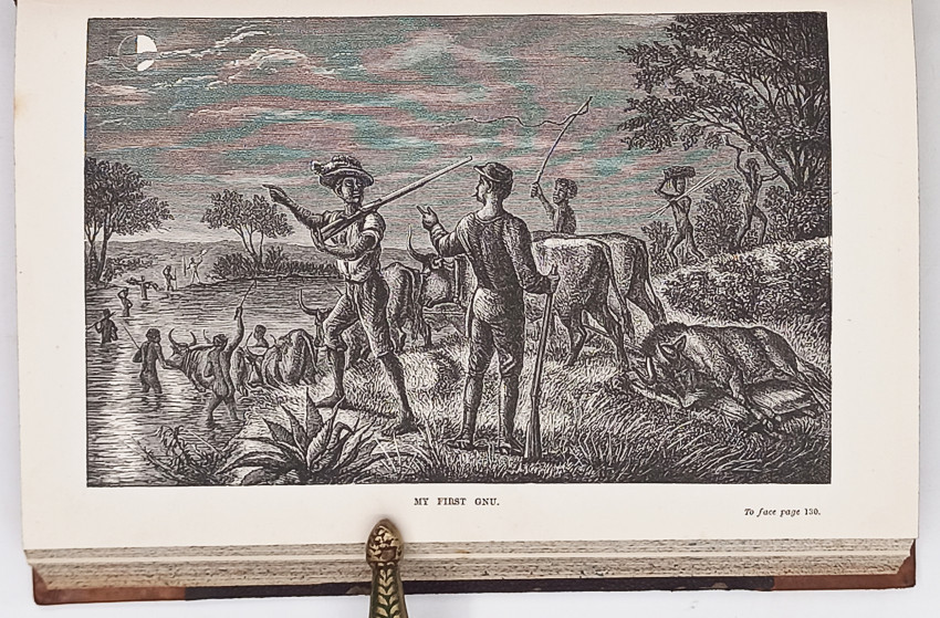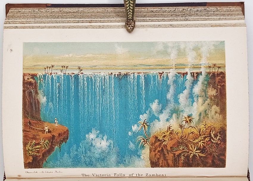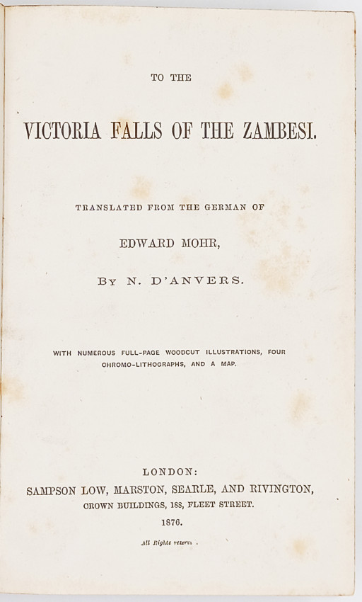 xiv + 462 pages, folding map, 4 chromolithographs including a fine view of Victoria Falls (page 323), 11 full-page wood engraved plates, lacks the portrait of the author as the frontispiece. Bound in half brown calf with mauve pebble-grained cloth sides, sprinkled edges, contents bright.
