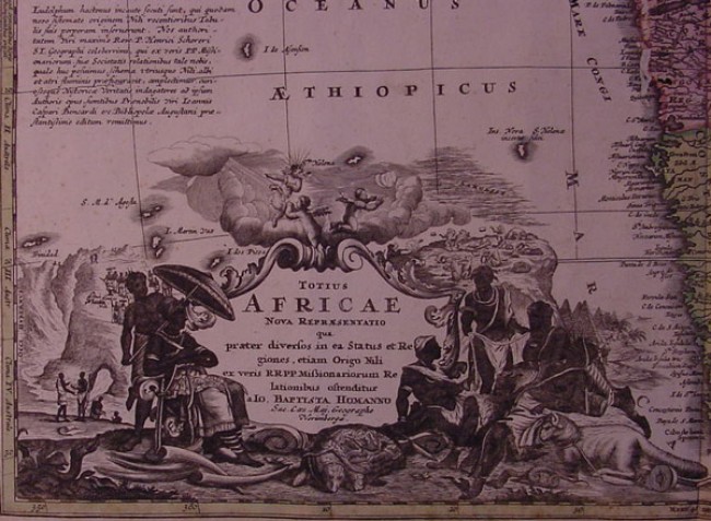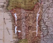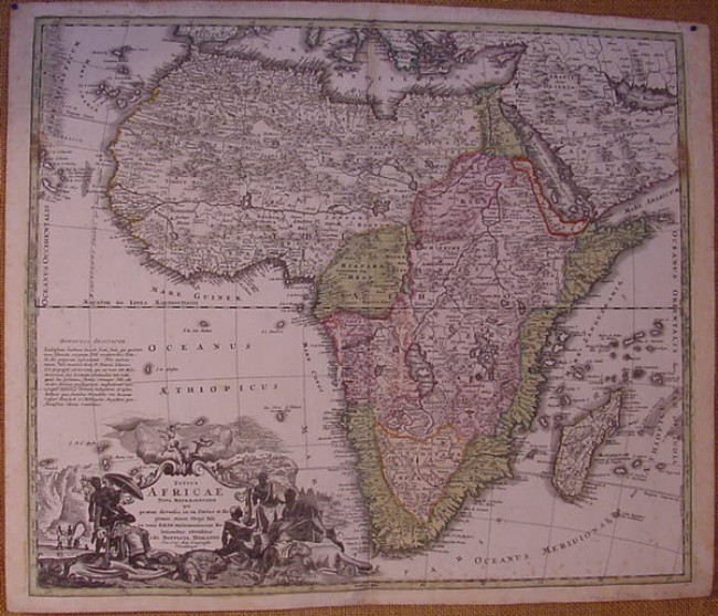 attractive, detailed and popular map helped possibly by its colour, it was poor geographically, with an extraordinary delineation of the Nile which is based partly on Ptolemy (rising in two large lakes, Zaire and Zaflan) and partly on the late 16th century discovery of the source of the Nile by the Portuguese Paez. This however is placed far to the south below Lake Zaire, a part of Abyssinia in 20deg south. The map is decorative with a large title-piece of negroes, elephant tusks, turtle, baboons, fat-tailed sheep with supporting trolley, etc. Condition: some foxing and soiling round the edges, and there is some insect damage, as illustrated in pic 2, which has been patched from the back